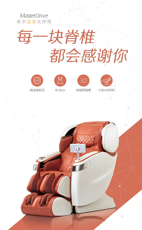 新升级4D机芯,突出量约达100mm、横向按摩约达185mm的较广按摩面积,带来更精准的按摩体验;按摩轮快速加热技术™, 50°温热按摩头深层放松背部紧绷肌肉,释放脊椎压力;快捷精准肩部检测技术™,智能人体重量灵敏感应。